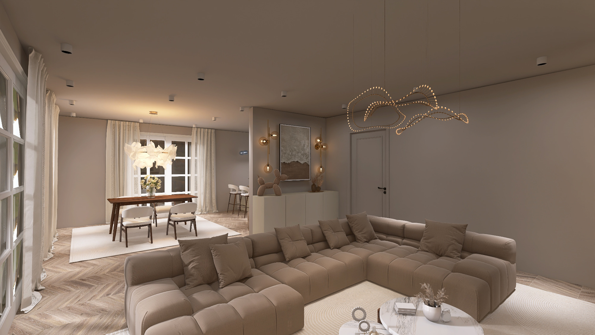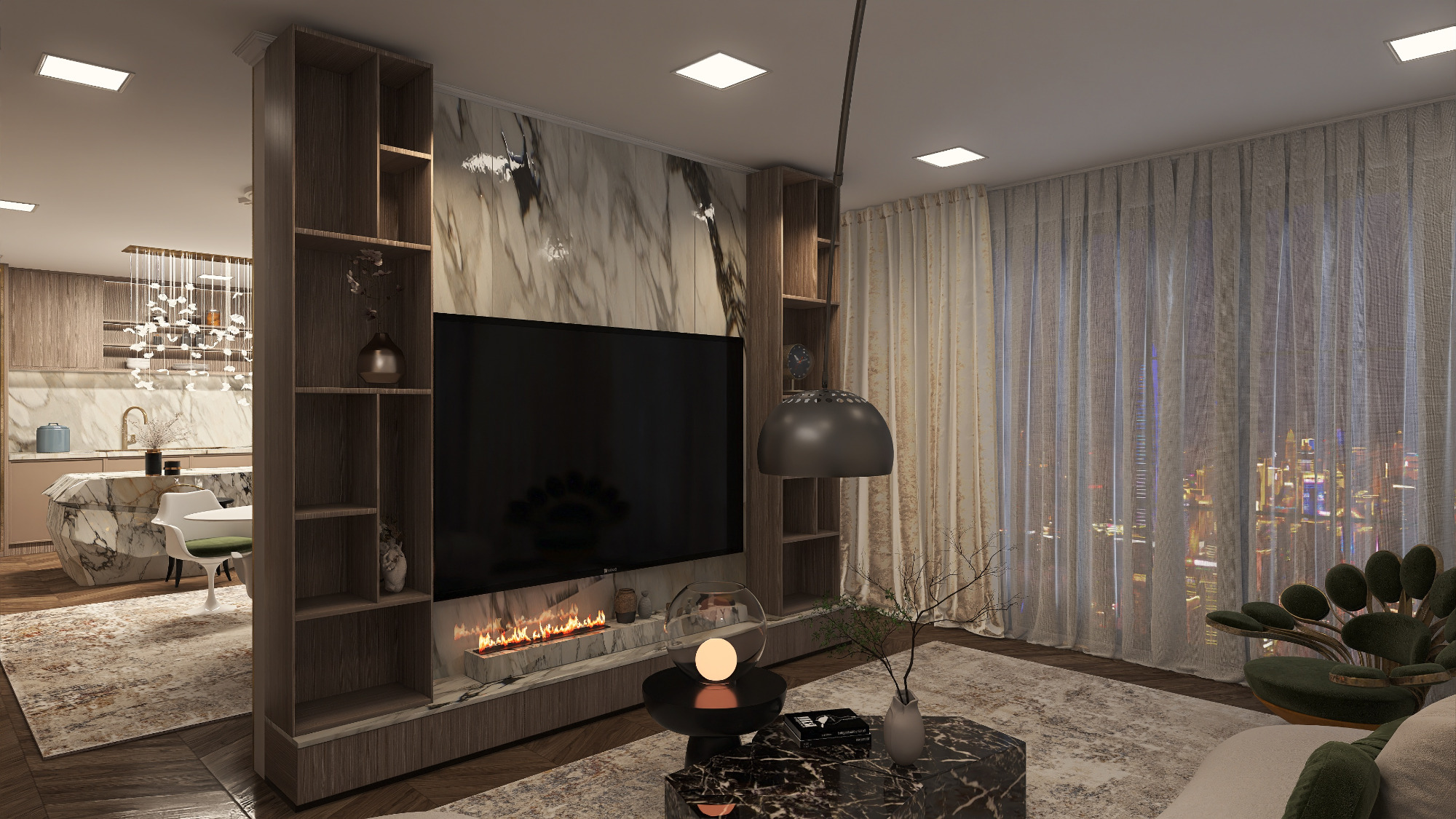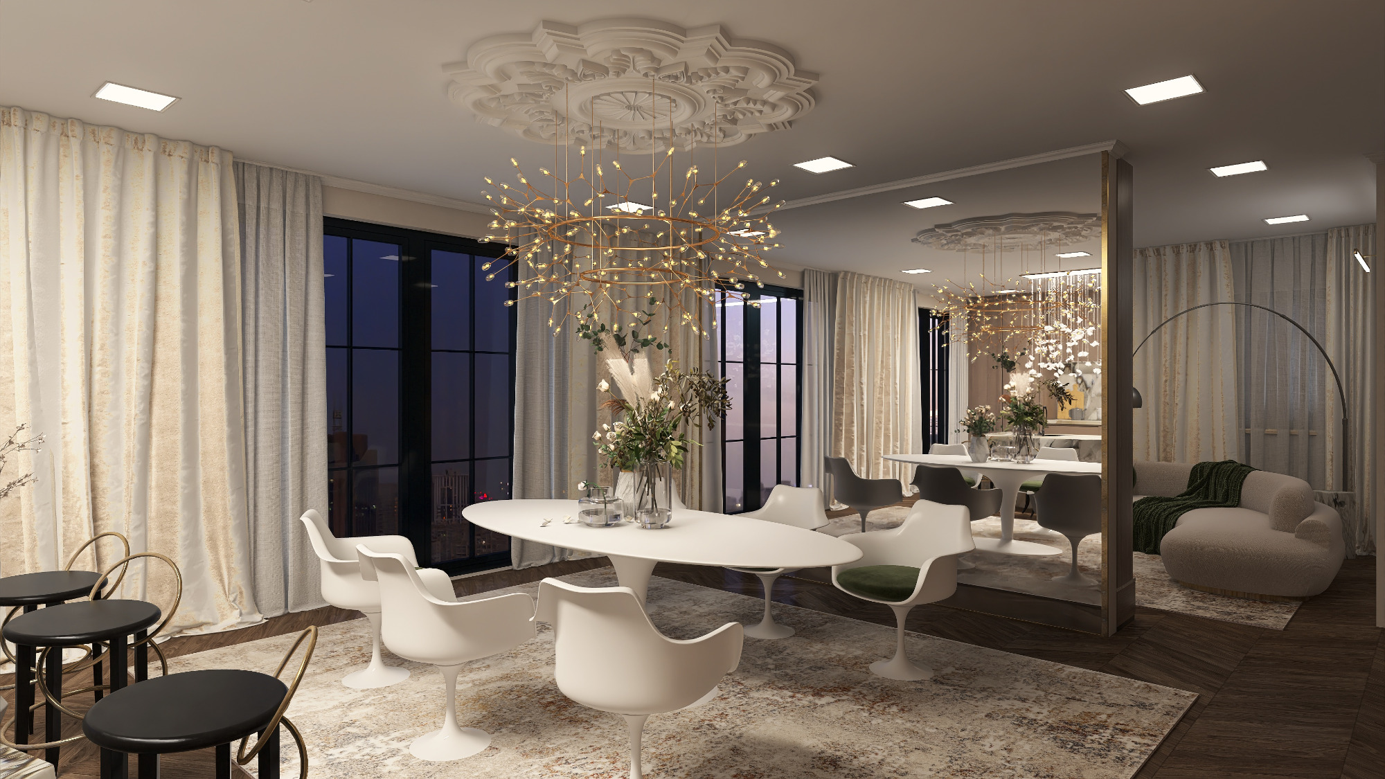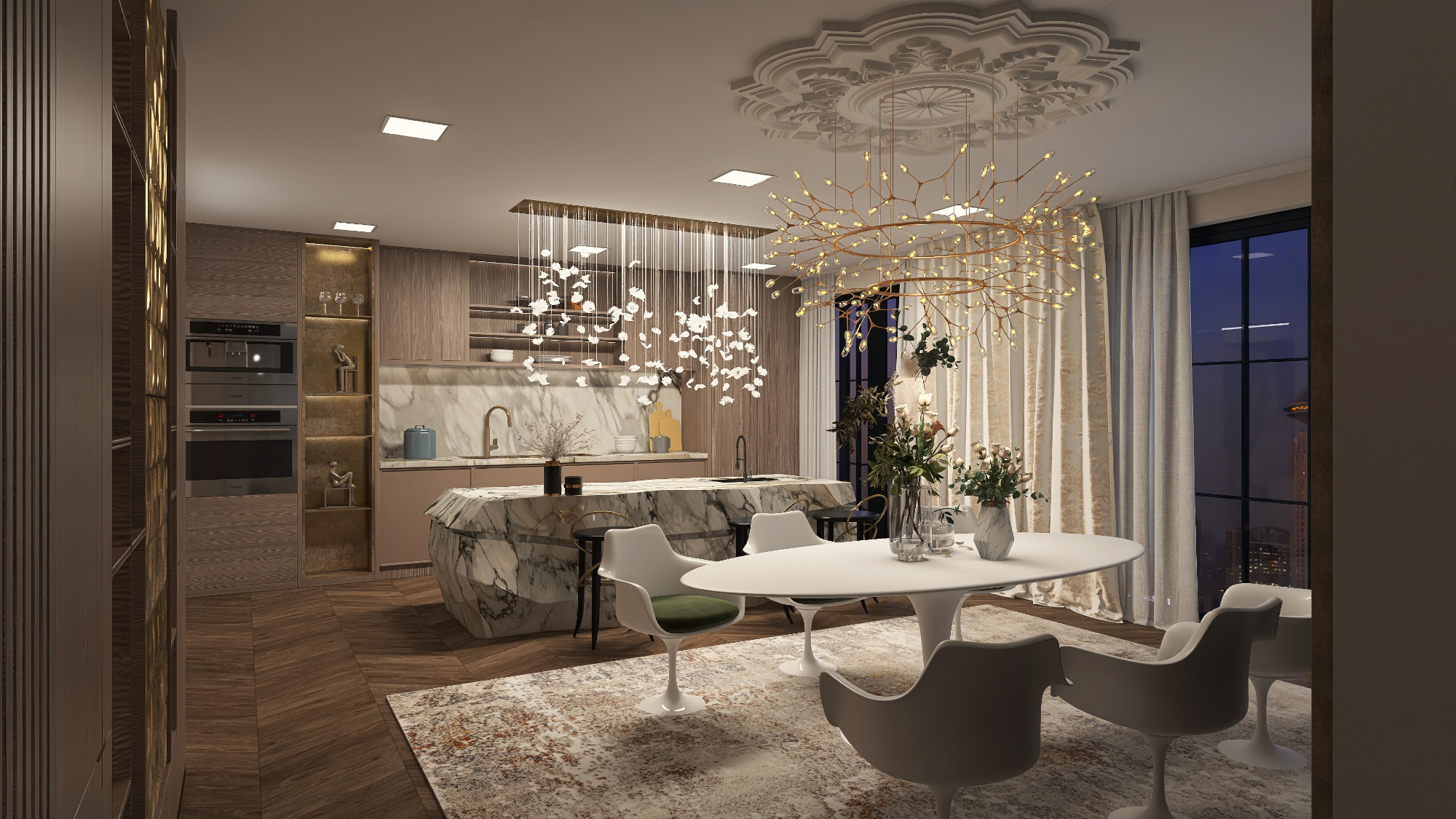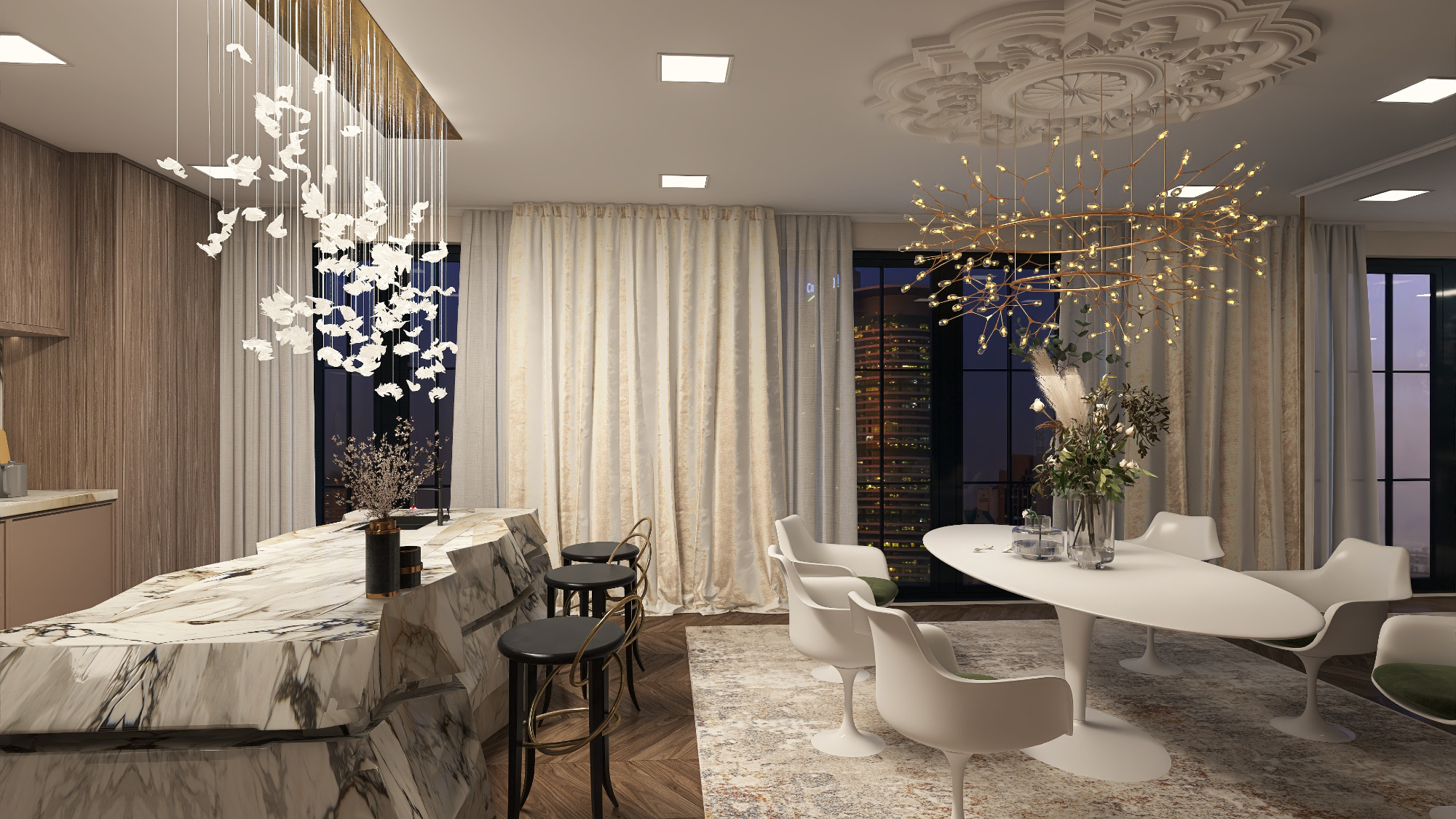 Bei dieser Penthousewohnung stand der Wunsch der Kundin im Mittelpunkt, einen Ort zu schaffen, an dem moderner Minimalismus und luxuriöse Eleganz harmonisch miteinander verschmelzen. Entstanden ist ein Zuhause, das den Zauber von Hollywood Glam versprüht – mit edlen Materialien, glänzenden Akzenten und einer stilvollen Inszenierung von Licht und Raum. Trotz der glamourösen Elemente wirkt das Interieur verspielt und leicht, ohne je überladen zu erscheinen. So entstand ein einzigartiges Wohngefühl, das Eleganz, Persönlichkeit und Wohlfühlatmosphäre perfekt vereint.
